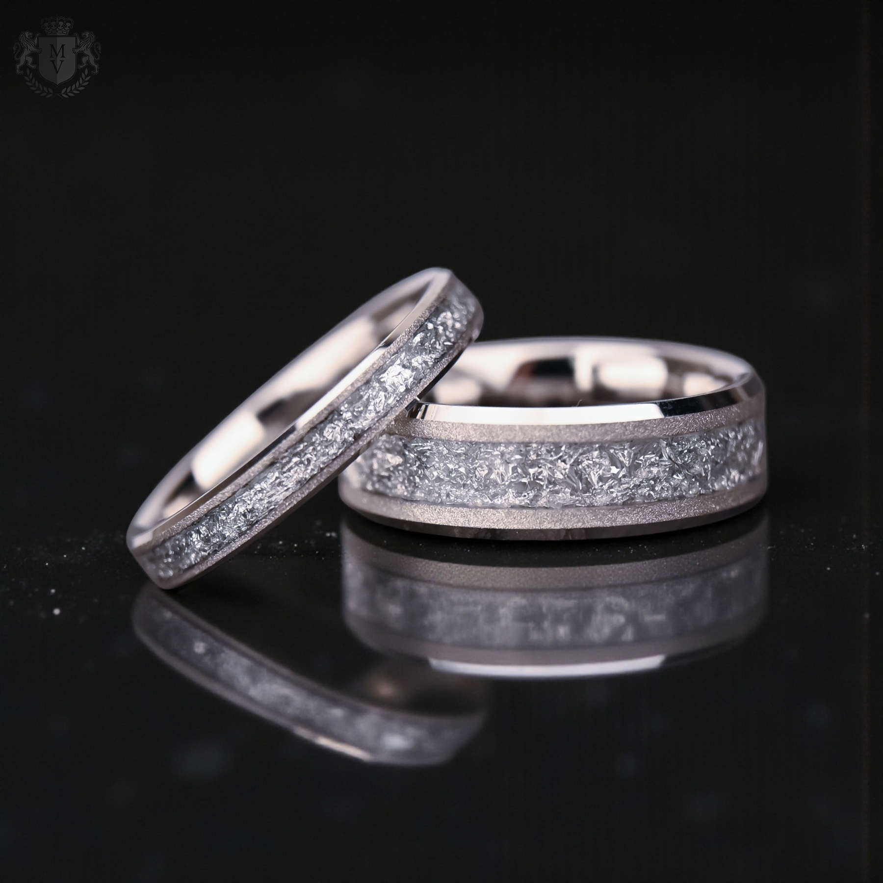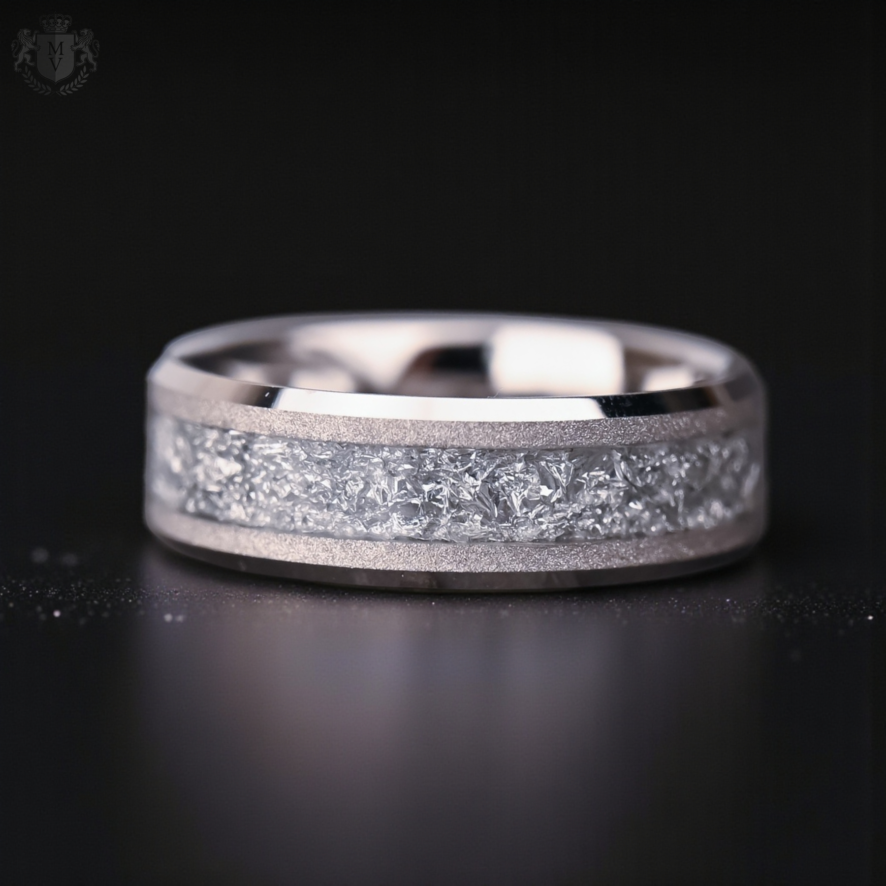 Aureum Silver brings a new interpretation of timeless craftsmanship. Crafted from ultra-durable tungsten carbide, this design features a refined white-gold–tone sandblasted finish that gives the band a soft, sophisticated glow. A shimmering silver-foil inlay runs through its center, creating a crisp, icy texture that reflects light with every movement.
